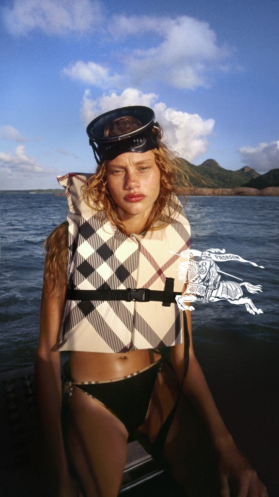 Burberry, Daniel Lee’nin arkadaşı Tyrone Lebon tarafından çekilen ilk mayo kampanyasında markanın ikonik desenini sahile taşıdı.