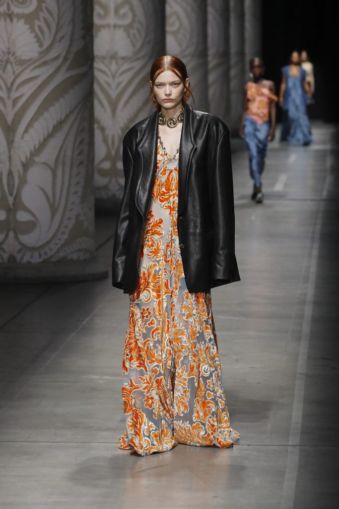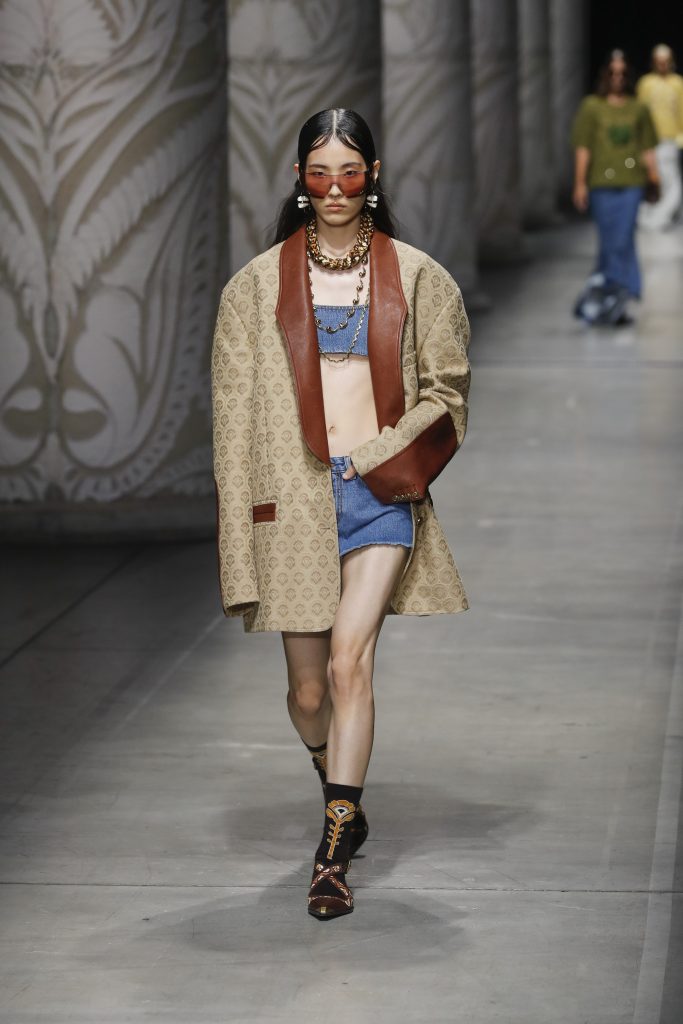 Teksas botların burunları kumaş örgülerle buluşuyor, geniş gömleklerin üzerinde gizemli bir adanın illüstrasyonları yeniden canlanıyor ve çizgiler, lüks kıvrımlarla birbirine bağlanıyor. Bu etki, aydınlanmış bir özgür ruh duygusuyla daha da güçleniyor. Koleksiyonda, bir siluetin içinde bulunan motifler ve tekrarlayan desenler, kontrast oluşturacak şekilde, mutlak ve karşı konulmaz bir kesinlikle çoğalıyor: Düz ve dikey ya da aşağı doğru açılan, geniş hacimlerle sarıp sarmalayan, uzun ve vücudu gizleyen zarf ceketler ve blazer’lar.
