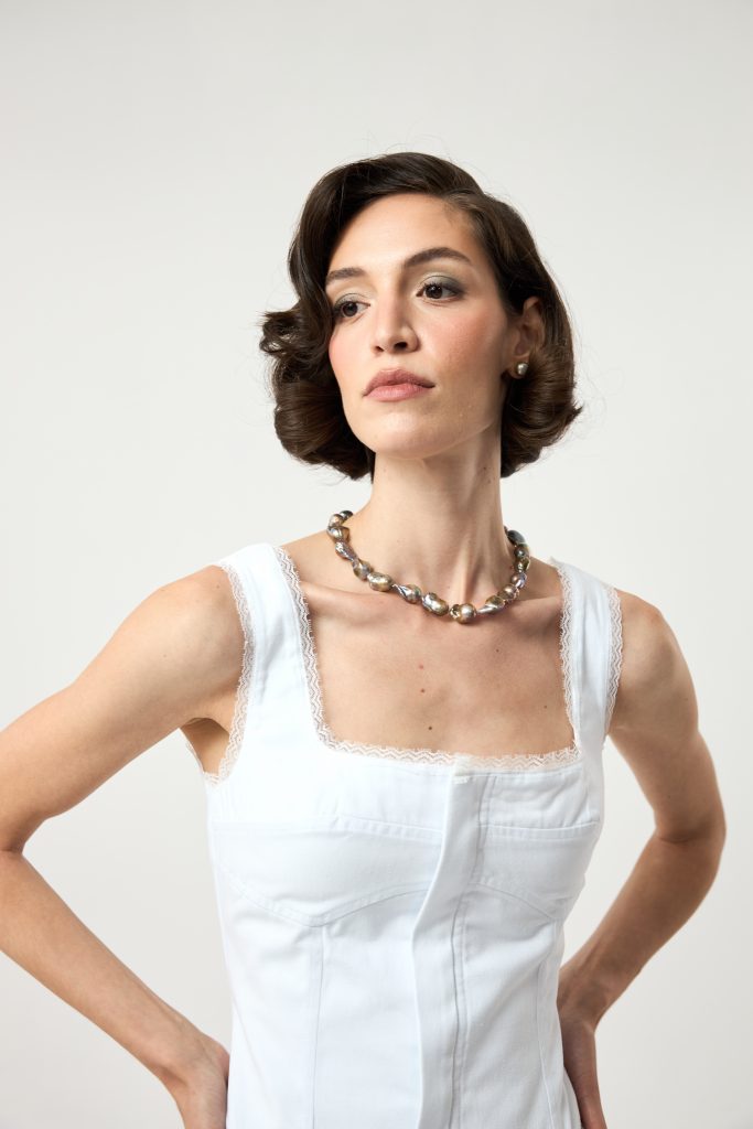Toplam 13 parçadan oluşan koleksiyonda elbiseler, gömlekler, büstiyerler ve takımlar öne çıkıyor. 1940’ların feminen kesimleri, 1960’ların genç ve modern estetiği ile 1990’ların minimal yaklaşımı koleksiyonda bir araya geliyor. Bel hattını vurgulayan ama aynı zamanda rahat bir kullanım sunan silüetler, Franny’nin tasarım dilinin merkezinde yer alıyor. Pamuk, ipek, keten ve cupro gibi doğal dokuların tercih edildiği koleksiyonun renk paletinde lacivert, ekru, krem ve yumuşak tonlar dikkat çekiyor. İddialı renklerden ziyade zamansız bir gardırop yaratmayı hedefleyen sade ve dengeli bir palet tercih ediliyor.