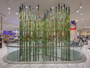 Aynı sanatçının ikinci enstalasyonu “Bamboo”, şansı, sevgiyi, mutluluğu, sağlığı ve bereketi sembolize eden doğal renkleriyle mağazanın tavanından alt kata süzülerek sonsuzluğu işaret ediyor. Her iki enstalasyonun toplamda 2900 adet atık cam şişenin dönüştürülmesiyle oluşturulması eserlerin sanatsal boyutunun yanı sıra geri dönüşüm sanatına olan saygıyı temsil ediyor.